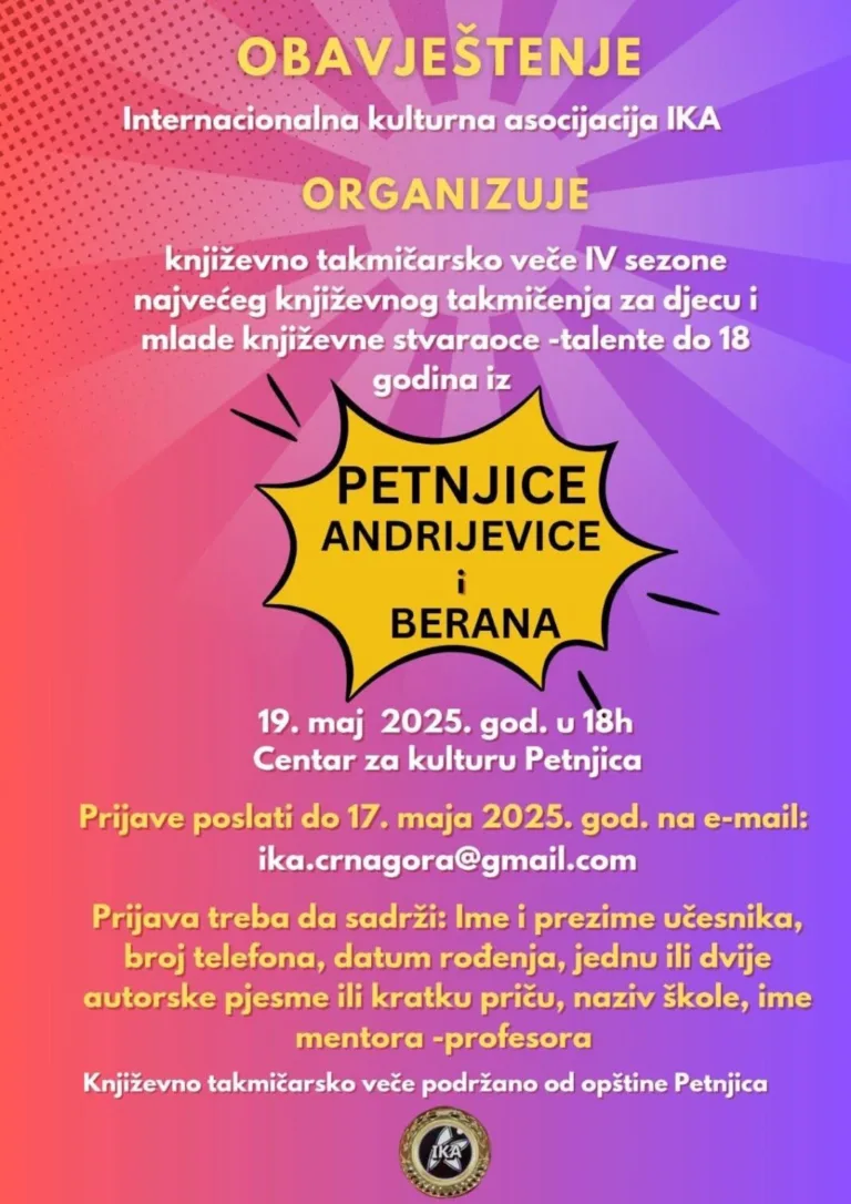 Internacionalna Kulturna Asocijacija IKA organizovala je književno takmičarsko veče IV sezone najvećeg književnog takmicenja za djecu i mlade književne stvaraoce do 18 godina iz Petnjice.