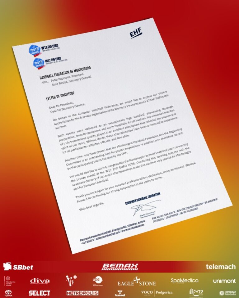 „Još jednom ste dokazali da Rukometni savez Crne Gore i Organizacioni odbor predstavljaju izuzetnog domaćina takmičenja mlađih kategorija – tradiciju koju sada cijene ne samo ekipe učesnice, već i EHF. Takođe, želimo da uputimo iskrene čestitke ženskoj kadetskoj reprezentaciji Crne Gore na osvojenoj bronzanoj medalji na Evropskom prvenstvu. Kombinovanje ovog sportskog uspjeha sa besprekornom organizacijom dva velika prvenstva učinilo je ovo ljeto posebnim i za Crnu Goru i za evropski rukomet. Još jednom hvala na vašem profesionalizmu, posvećenosti i predanosti. Radujemo se nastavku naše uspješne saradnje u godinama koje dolaze“, navodi se u pismu.
