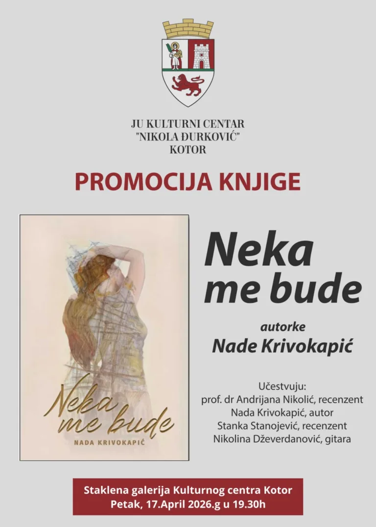 Ljubitelji poezije imaće priliku da u Kotoru prisustvuju promociji nove zbirke „Neka me bude“, autorke Nade Krivokapić. Događaj organizuje JU Kulturni centar “Nikola Đurković” Kotor, a biće održan u petak, 17. aprila, sa početkom u 19.30h, u prostoru Staklene galerije.